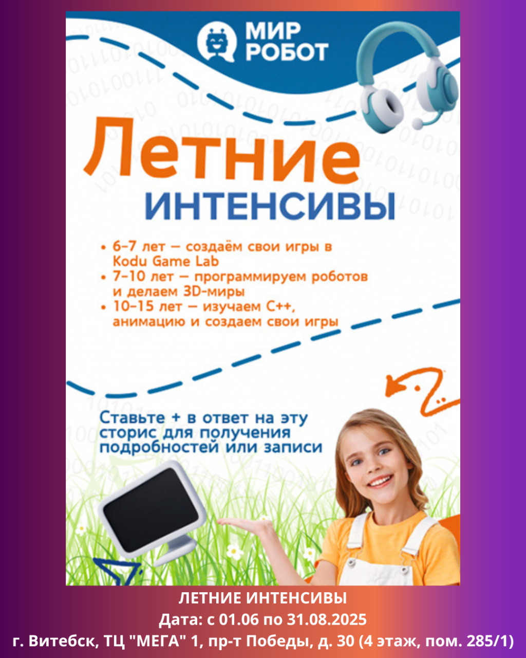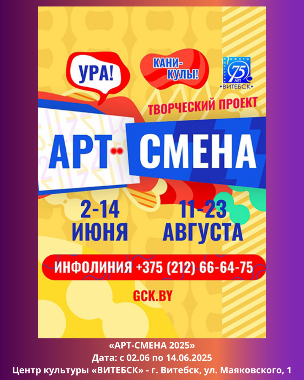 В центре культуры «ВИТЕБСК» стартовала «АРТ-СМЕНА 2025». В программе: интенсивы, мастер-классы, интеллектуальные марафоны, экскурсии, музеи, театры, кино, игры, конкурсы, квесты, прогулки... А ещё множество приятных сюрпризов и неожиданностей.
