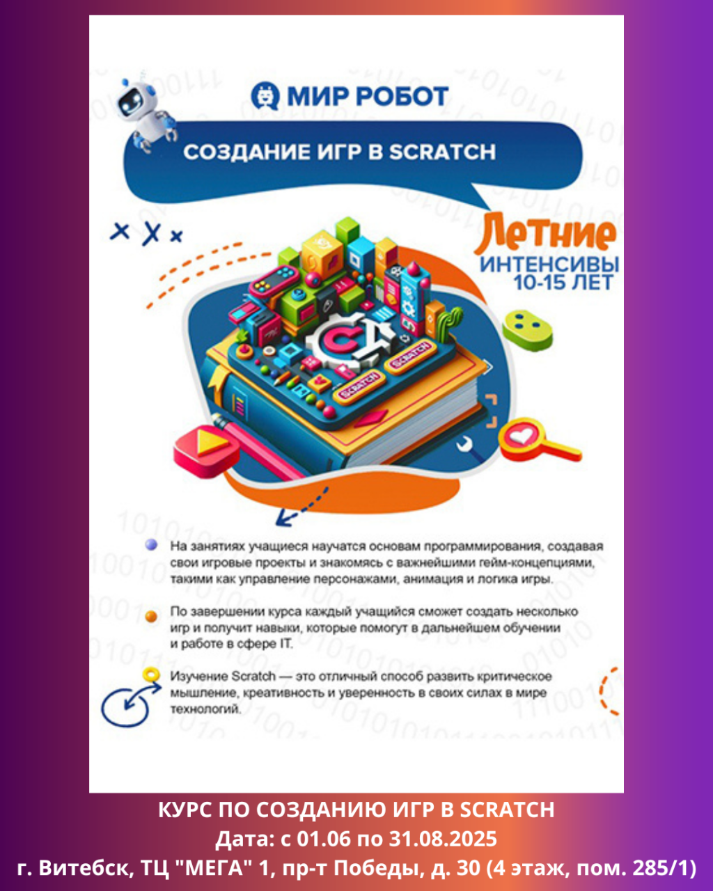 Этот курс предлагает детям увлекательное погружение в мир разработки игр, где они смогут не просто играть, но и создавать свои собственные игровые миры. Ребята 7-14 лет идут на Курс по созданию игр в Scratch. Это идеальная возможность для вашего ребенка погрузиться в мир программирования в увлекательной форме.
