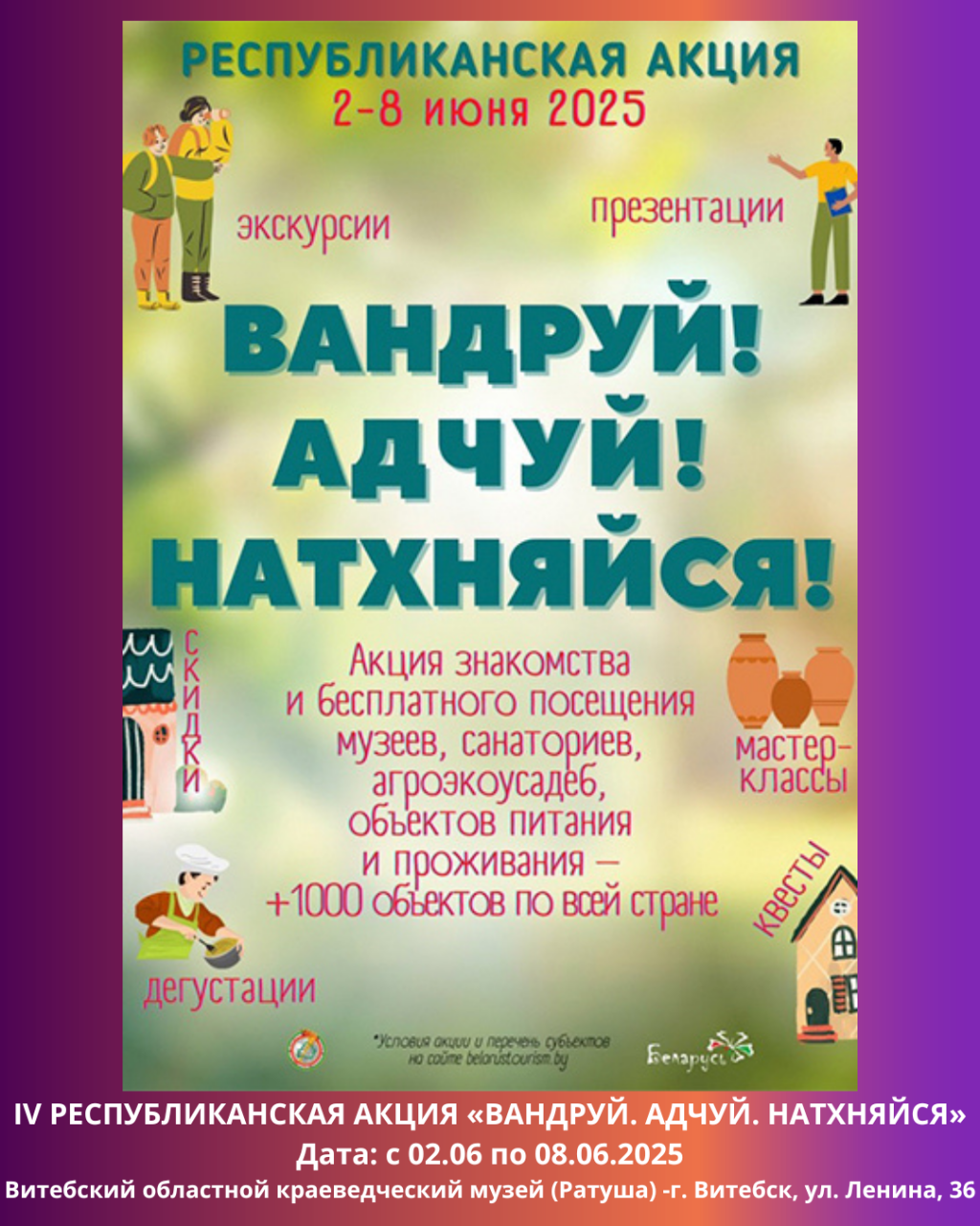 Витебский областной краеведческий музей присоединяется к IV Республиканской акции «Вандруй. Адчуй. Натхняйся», которая пройдет в Беларуси со 2 по 8 июня 2025 года. Организаторами акции выступают Министерство спорта и туризма Республики Беларусь и Национальное агентство по туризму. Приглашаем в эти дни на бесплатные мероприятия в филиалах ВОКМ.