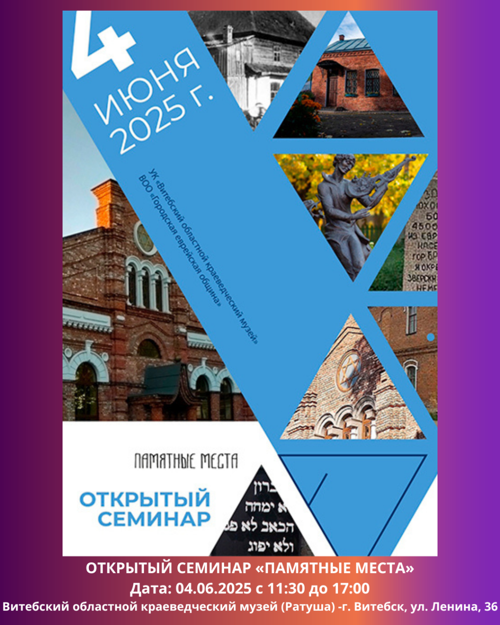 В среду в Ратуше пройдет открытый семинар «Памятные места». Организаторы открытого семинара – Витебское общественное объединение «Городская еврейская община» и учреждение культуры «Витебский областной краеведческий музей». Целью мероприятия является создание экскурсионного маршрута по Витебску и Витебской области, знаковым для истории и культуры белорусов и евреев.