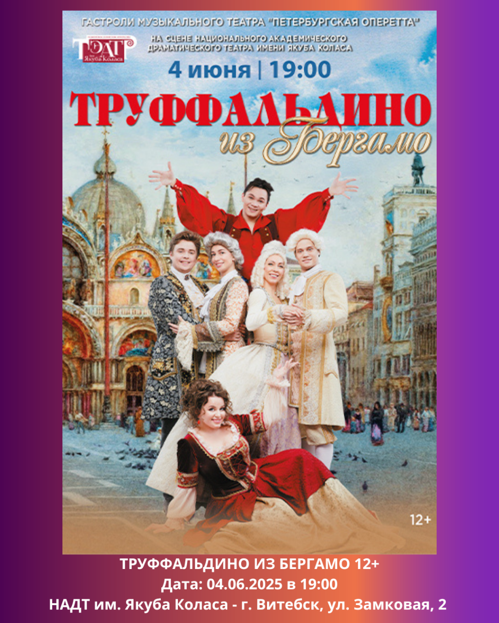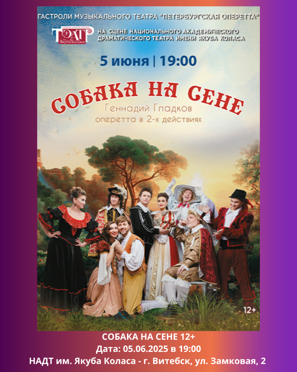 В рамках гастролей музыкального театра "Петербургская оперетта" на сцене национального академического драматического театра имени Якуба Коласа в среду будет представлен мьюзикл Труффальдино из Бергамо 12+, а в четверг в том же исполнении - Собака на сене 12+.