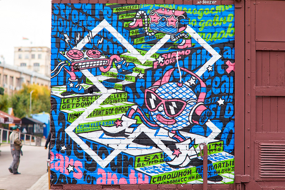 А ещё у жителей и гостей Минска есть возможность увидеть музыку своими глазами! В пространстве LIDBEER DVOR появилось необычное «музыкальное» граффити: совместно с Bang & Olufsen, дизайнером и автором иллюстрации Лёшей Лимоновым и художником-граффитистом Сергеем Климковичем сервис изобразил самые популярные композиции этого лета. В центре граффити – лестница из чарта, по которой поднимаются музыкальные персонажи: диско-шар, пульт и колонка. А фоном для центрального сюжета стали строчки из любимых песен белорусов.