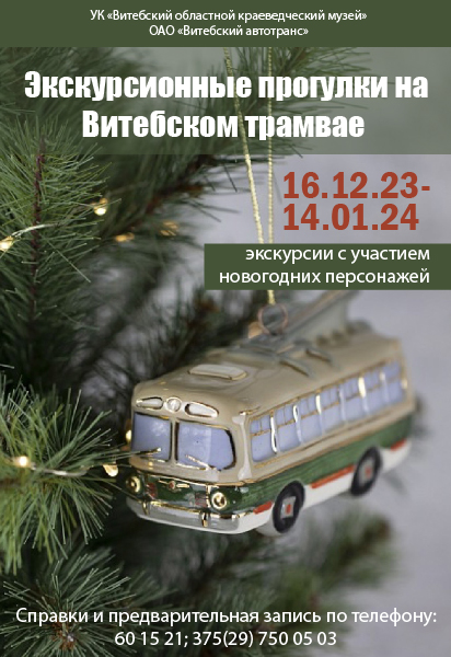 Учреждение культуры «Витебский областной краеведческий музей» и ОАО «Витебский автотранс» приглашает вас совершить экскурсионную прогулку на Витебском трамвае с участием новогодних персонажей. Во время экскурсии вы познакомитесь с историей города Витебска, узнаете для себя много нового и интересного.