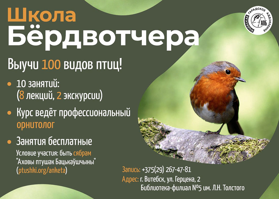 Хотите научиться узнавать 100 обычных видов птиц? Витебское городское отделение общественной организации “Ахова птушак Бацькаўшчыны” (АПБ) объявляет набор в Школу бердвотчера.