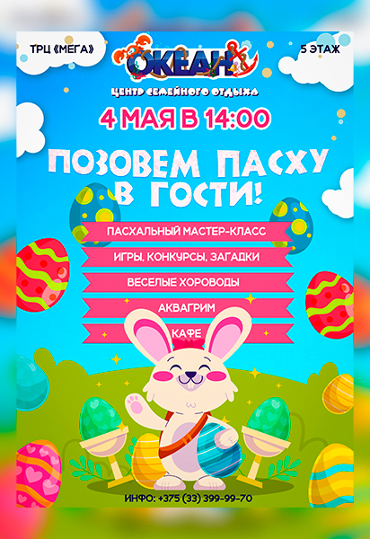 Детский развлекательный центр «ОКЕАН» приглашает на Праздник Пасхи 4 мая в 14.00. А в Детском развлекательном центре «BOOM» в 16.00 будут ПАСХАЛЬНЫЕ ЗАБАВЫ С МАШЕНЬКОЙ.