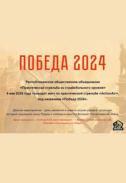 Республиканское общественное объединение «Практическая стрельба из страйкбольного оружия» 4 мая 2024 года проводит матч по практической стрельбе «ActionAir», под названием «Победа 2024». Данное мероприятие – дань уважения и памяти нашим дедам и прадедам, которые защищали нашу Родину и победили врага в Великой Отечественной войне.