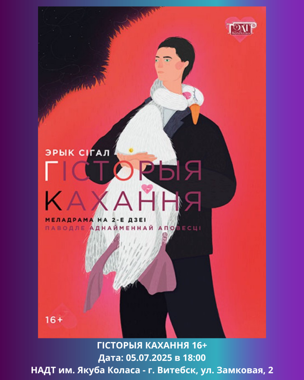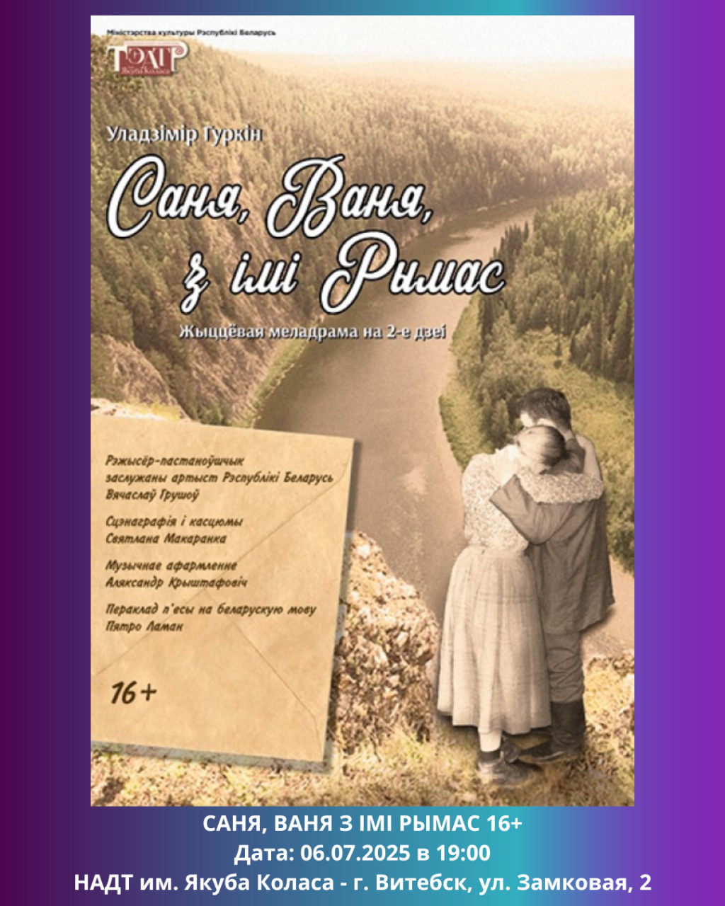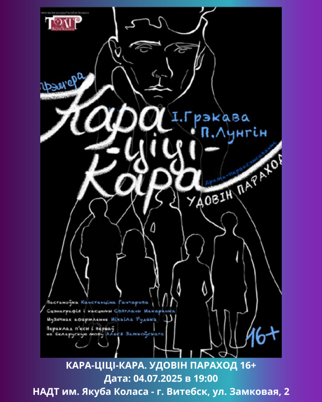 Национальный академический драматический театр имени Якуба Коласа 4 июля приглашает на спектакль КАРА-ЦІЦІ-КАРА. Удовін параход 16+, 5 июля - на спектакль Гісторыя кахання 16+, а 6 июля - на Саня, Ваня з імі Рымас 16+.