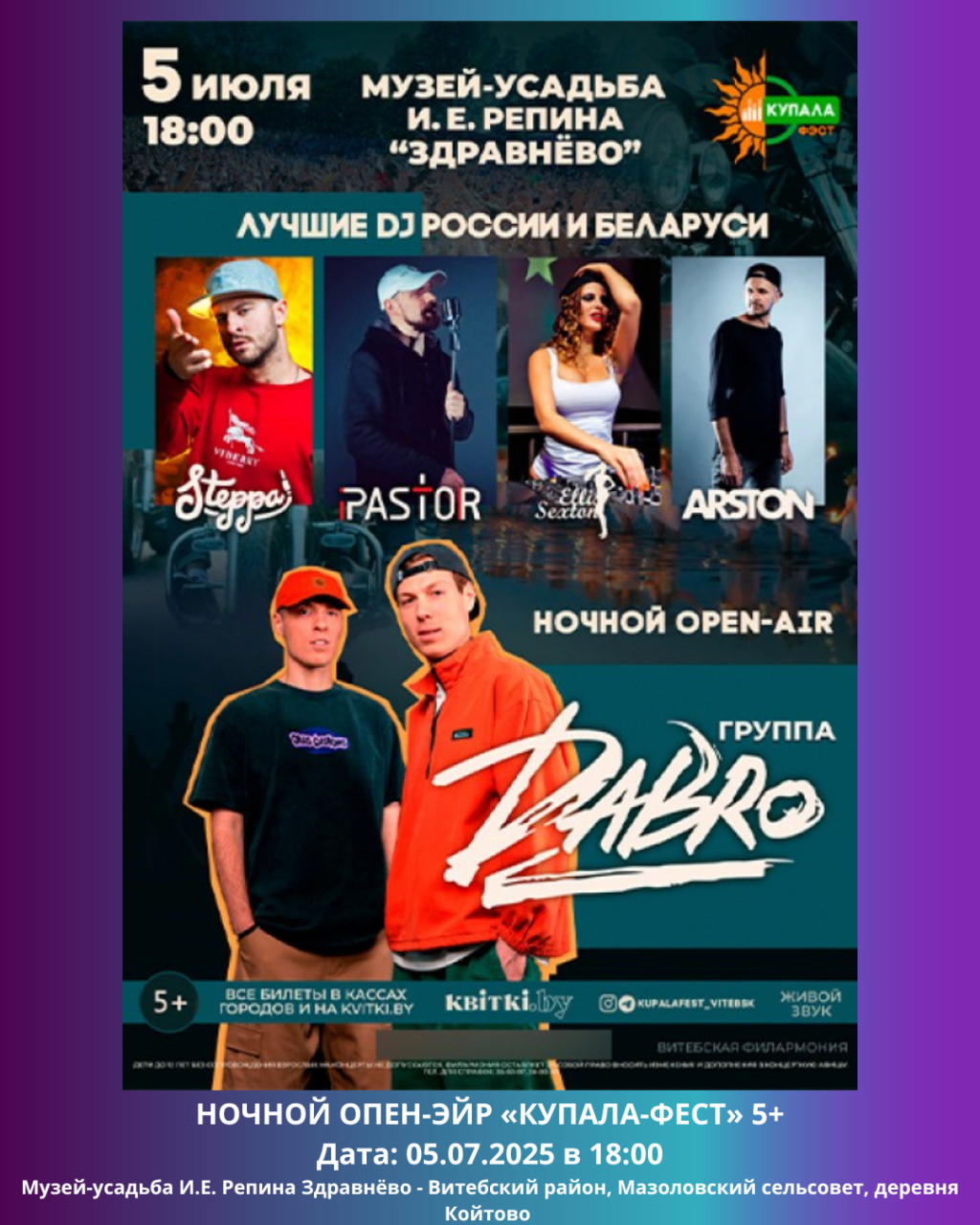 Ночной опен-эйр «Купала-фест» 5+ состоится в музее-усадьбе И.Е. Репина Здравнёво в субботу. Нас ждут аутентичные локации с купальской атмосферой, ночной танцевальный марафон с топовыми диджеями Беларуси, выставка мотоциклов байкерских клубов, русалки и купальский хоровод, добывание огня и зажжение главного Купальского костра, фудкорты, фотозоны, концерт с участием лучших кавер-групп Беларуси, специальная купальская программа ансамбля «Талака», походная баня и мастер-класс от одного из лучших парильщиков Беларуси, ворожба, интерактив, квесты... Специальный гость – группа "DABRO"!