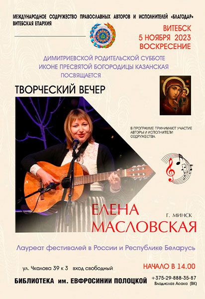 Творческий вечер Елены Масловской пройдет в Библиотеке им.Евфросинии Полоцкой в воскресенье. Вход свободный