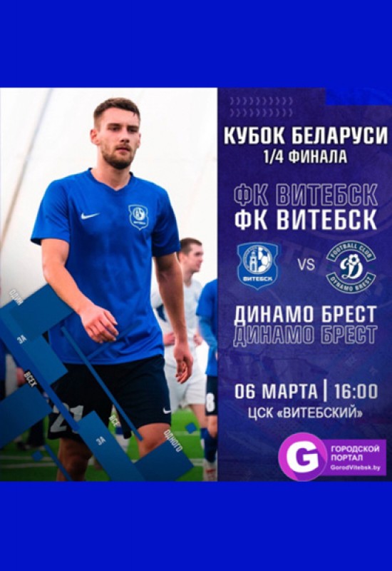 В это воскресенье пройдёт 1/4 финала Париматч Кубка Беларуси по футболу 2021/2022. ФК «Витебск» примет дома ФК «Динамо-Брест». 6 марта начало матча в 16:00. В честь Международного дня женщин вход для всех женщин и девушек вход бесплатный. Спортивные мероприятия в Витебске>>
