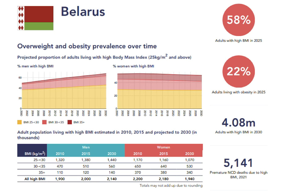 Беларусь также не избежала этой негативной динамики. Согласно оценкам аналитиков и данным Всемирного атласа ожирения (World Obesity Atlas 2025) – независимого международного исследования – в 2025 году более половины взрослого населения страны, около 58%, имели индекс массы тела ≥ 25 кг/м²), что свидетельствует о широком распространении избыточного веса и ожирения среди белорусов. Данные этого рейтинга показывают, что Беларусь остается в числе стран с относительно высоким уровнем ожирения среди взрослых: по последним доступным сведениям показатель ожирения (ИМТ ≥ 30) составляет около 22%, с несколько более высокими значениями у женщин по сравнению с мужчинами. Отдельные международные исследования также указывают на устойчивый рост доли людей с лишним весом в стране на протяжении последних десятилетий.