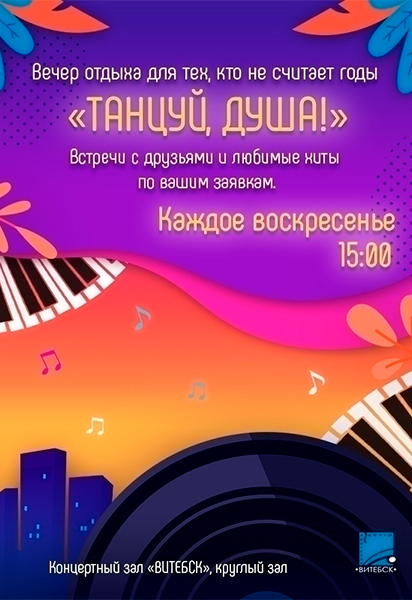 «Возраст – танцам не помеха!», – считают в Центре культуры «ВИТЕБСК». И как же здорово, что среди жителей города на Двине есть наши единомышленники. И много! Дорогие витебчане, мы рады пригласить вас на танцевальную программу «ТАНЦУЙ, ДУША!». Воскресенье, КЗ Витебск, 15.00.