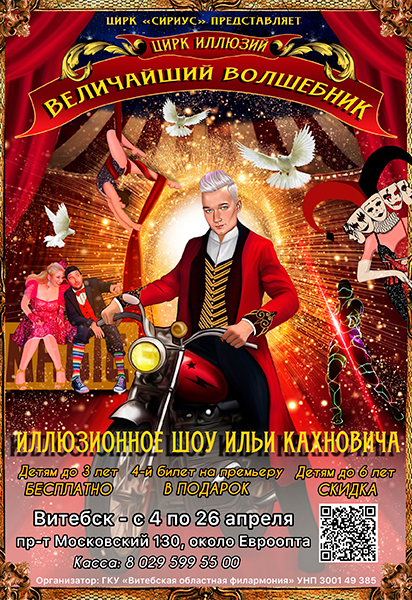 Премьера НОВОГО грандиозного иллюзионного шоу Ильи Кахновича «ЦИРК ИЛЛЮЗИЙ: ВЕЛИЧАЙШИЙ ВОЛШЕБНИК». Премьера уже сегодня в 18.30. Цирк пробудет у нас по 26 апреля. Билеты раскупаются очень быстро, поэтому не тяните с их приобретением!