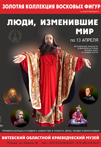 Продолжает свою работу выставка «Люди, изменившие мир» из Санкт-Петербурга. Золотая коллекция восковых фигур – это восковые копии выдающихся личностей, оставивших след в истории. Это герои разных эпох – от древних времен до современности: Пророк Моисей и Исайя, царь Ирод Антипа и Саломея, апостол Павел, благоверные святые князья Владимир и Александр Невский, княгиня Ольга, преподобная Евфросиния Полоцкая и Серафим Саровский, художник Илья Репин, Христофор Колумб, Будда, Чингисхан, Распутин и царская семья, Пушкин, Гончарова и Дантес, Гоголь, Достоевский, а также актеры мирового кино и мадам Тюссо. Выставка будет работать по 13 апреля.