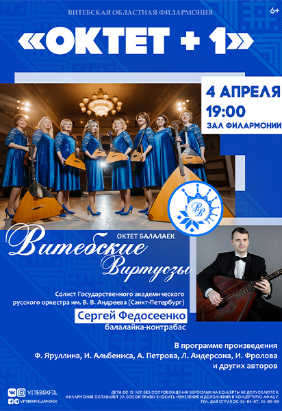 В филармонии "Витебские виртуозы" сыграют с солистом Государственного академического русского оркестра им. В.В. Андреева (Санкт-Петербург) Сергеем ФЕДОСЕЕНКО (балалайка-контрабас) в концерте «ОКТЕТ+1» 6+.