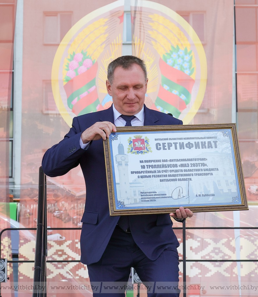 Александр Субботин также передал генеральному директору ОАО «Витебскоблавтотранс» Александру Федуковичу сертификат на получение 10 новых троллейбусов «МАЗ 203Т70», приобретенных за счет средств областного бюджета.