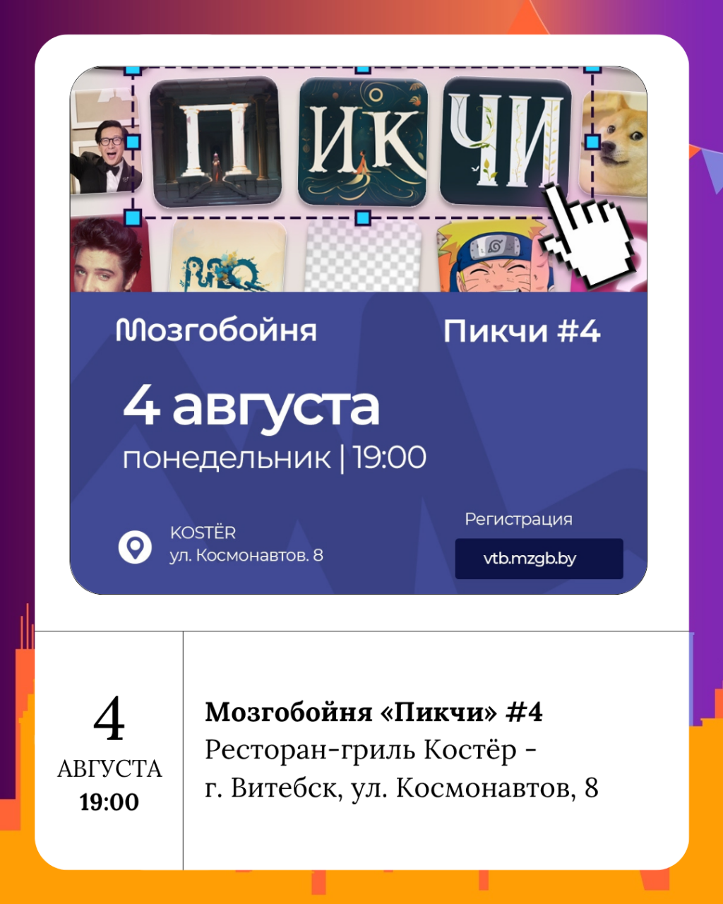 По традиции предлагаем начать неделю в Мозгобойне. Сегодня там Пикчи #4 - Пикчи, а 7 августа - Классическая игра #142 - Классика.