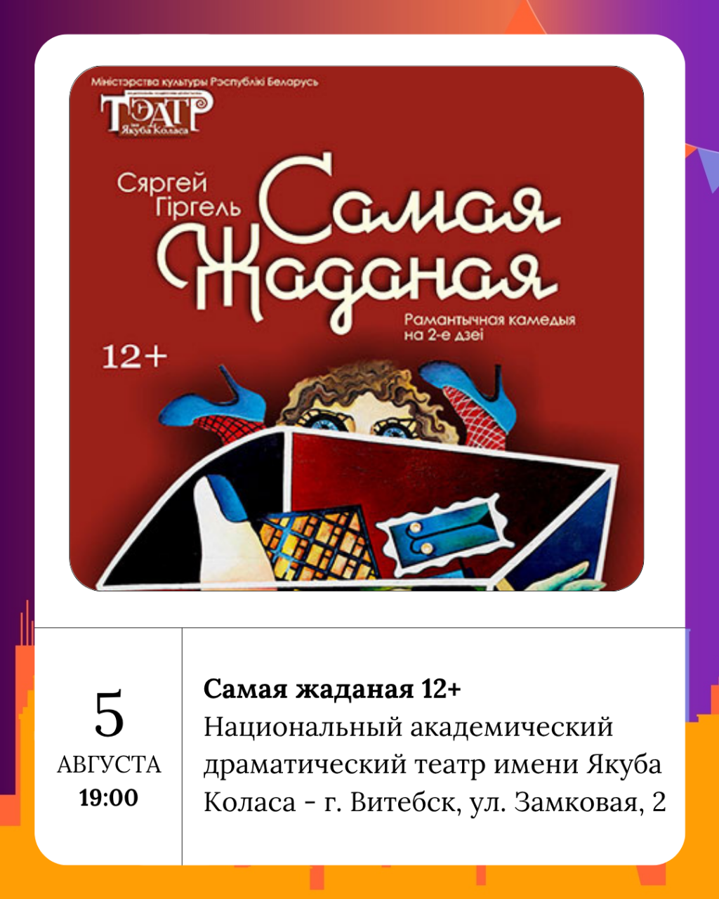 Национальный академический драматический театр имени Якуба Коласа приглашает на спектакль Самая жаданая 12+ во вторник, а в среду - на Парашутыст 16+.