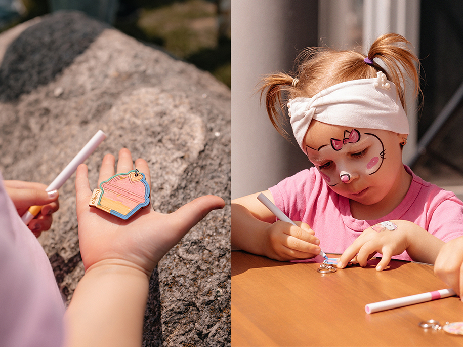 Пока одни дети участвовали в конкурсах и состязались за подарки, другие – расписывали деревянные брелоки во время мастер-класса. Ребята с помощью красок смогли создать уникальные сувениры и забрать их себе или подарить родителям.