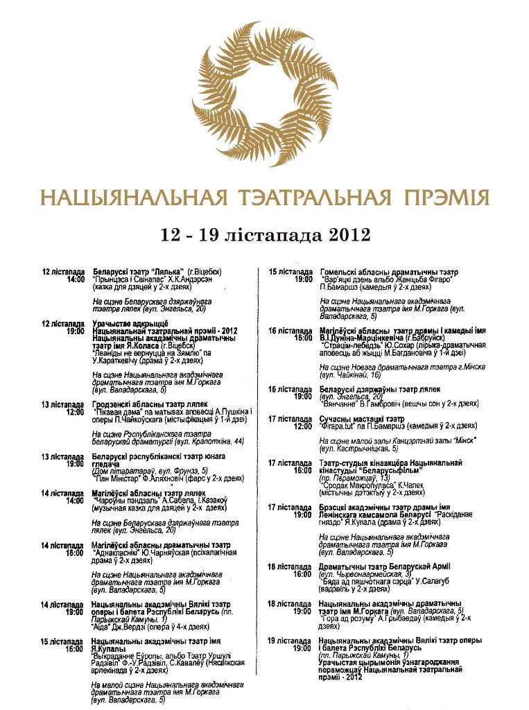 Номинантами Национальной театральной премии стали 16 профессиональных театров Республики Беларусь со спектаклями, созданными в период с 01.01.2010 по 01.07.2012, а именно:
