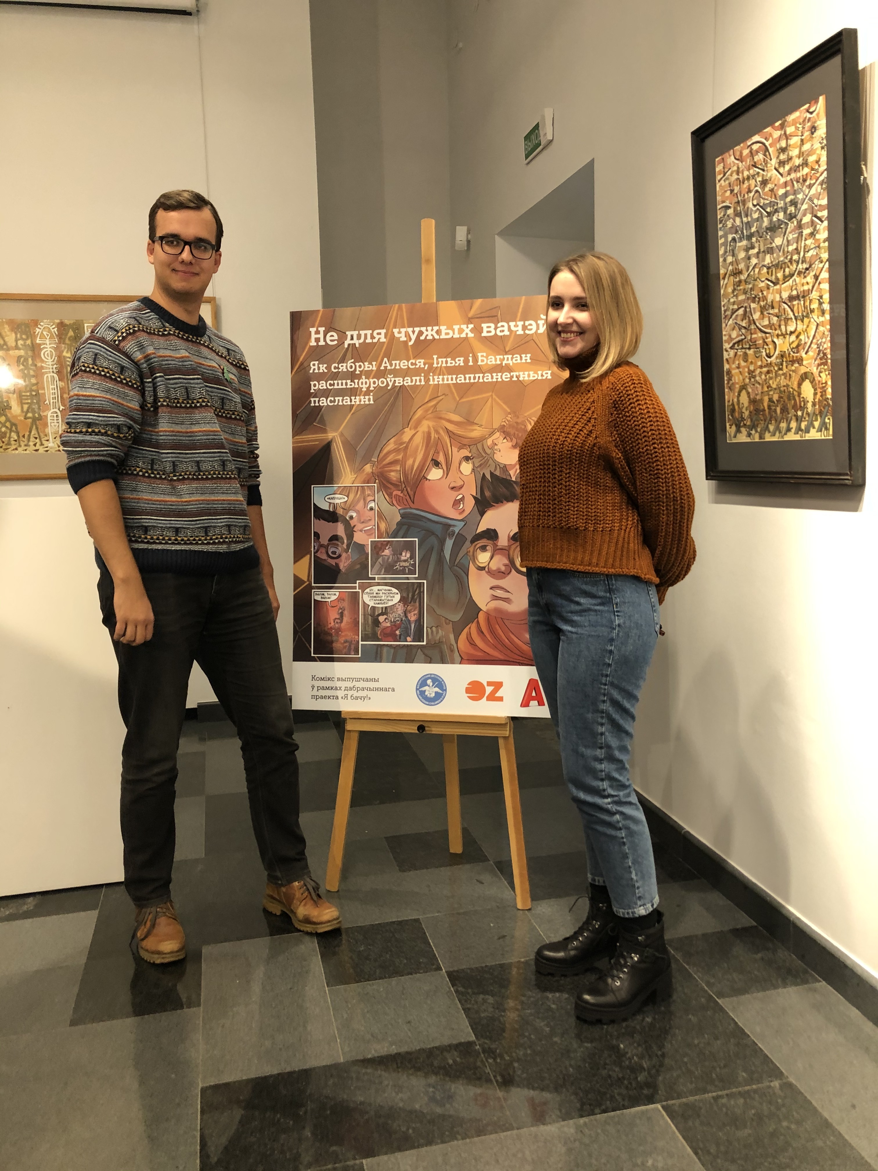 Над историей работали Ольга Алданова (сюжет, иллюстрации) и Никита Сенников (сюжет) – представители творческой группы «Сучасны комікс», созданной несколько лет назад для объединения всех авторов нашей страны, которые развивают этот жанр. Ольга и Никита приехали в Витебск вместе с большой командой проекта «Я вижу!»и рассказали ученикам Детской художественной школы, как использовать уникальный язык комикса.