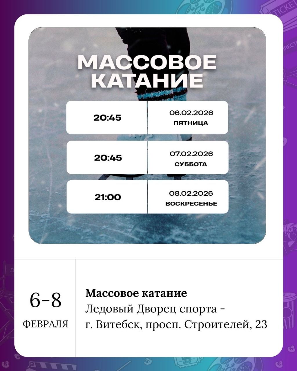 Расписание сеансов массового катания на этой неделе: 6 февраля — 20:45, 7 февраля — 20:45, 8 февраля — 21:00. Катание под музыку — идеальный способ встряхнуться и почувствовать себя живее зимнего ветра.