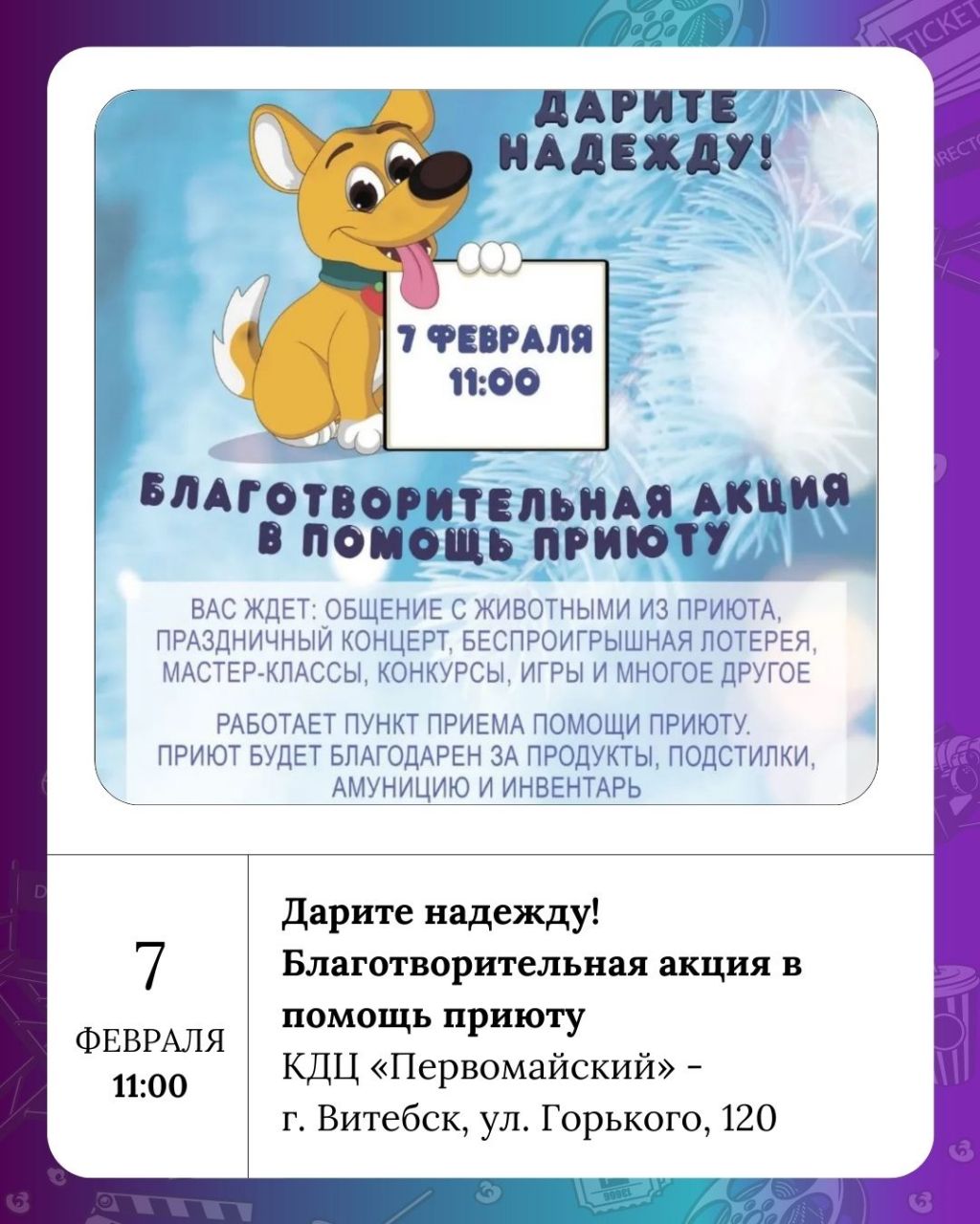 Благотворительная акция в помощь приюту пройдёт в субботу в КДЦ «Первомайский». Вас ждет: общение с животными из приюта, праздничный концерт, беспроигрышная лотерея, мастер-классы, конкурсы, игры и многое другое.