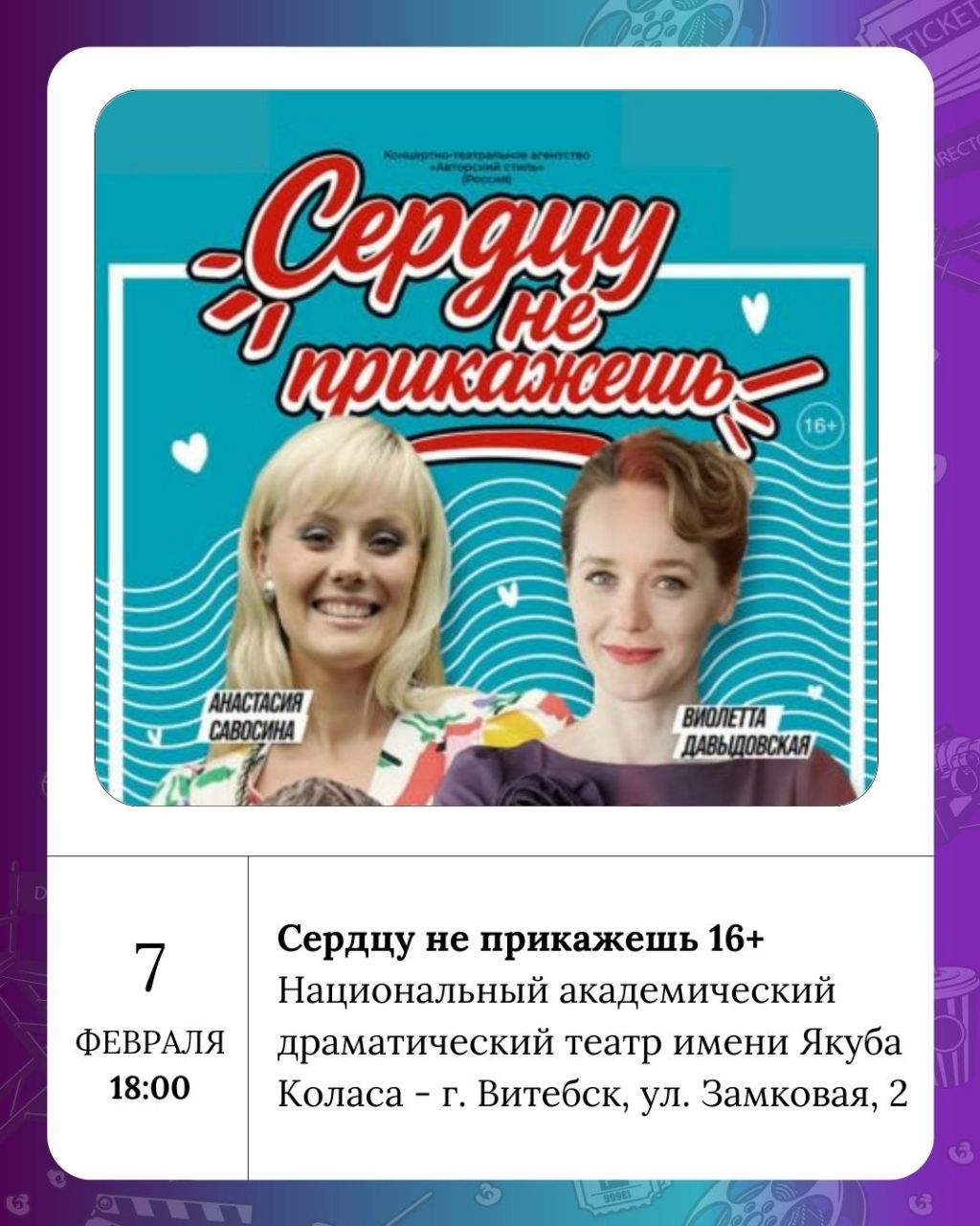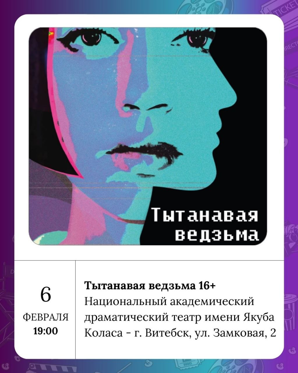 Национальный академический драматический театр имени Якуба Коласа сегодня приглашает на спектакль Тытанавая ведзьма 16+, завтра - на Сердцу не прикажешь 16+ в исполнении российских актеров Анастасии Савосиной, Виолетты Давыдовской, Дмитрия Ратомского и Петра Баранчеева, а в воскресенье - на Вяселле-буф 16+.