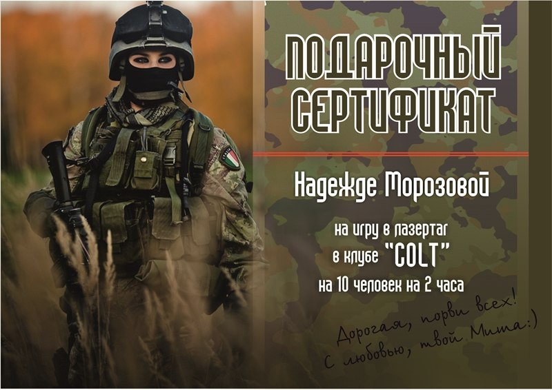 Подарочные сертификаты "с характером" - необычный сюрприз к 8 Марта: сертификат не в солярий, а на "войнушку"!