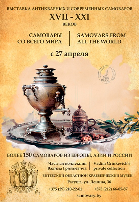 В Витебском областном краеведческом музее открылась выставка самоваров из частной коллекции Вадима Николаевича Гринкевича «Самовары со всего мира». История самовара – удивительна, одновременно, хорошо известная каждому, она полна неразрешимых загадок. Если верить одной из версий, корни самовара уходят куда глубже, чем кажется при первом рассмотрении. Согласно исследованиям, современный самовар происходит из мест, куда ведут все дороги на Земле – Древнего Рима. Археологи обнаружили приборы, работающие по принципу самовара. Невероятно, но напитки из самоваров пили римляне ещё во времена античности. Выставочный проект «Самовары со всего мира» – захватывающее путешествие по исторической географии самоваров разных народов. Из трехсот самоваров, насчитывающихся в коллекции, зрителю будут представлены более восьмидесяти самых интересных экземпляров. В экспозицию проекта вошли самовары из России, Италии, Франции, Китая и других зарубежных стран. Возраст некоторых экспонатов, представленных на выставке, насчитывает уже более трех сотен лет. Подробнее о выставке>>