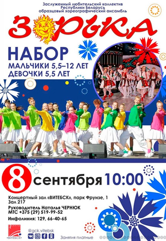 Центр культуры «ВИТЕБСК» продолжает наборы взрослых и детей в свои дружные творческие коллективы. Так, например, в это воскресенье пройдет Набор в творческий коллектив ЗОРЬКА 5+.