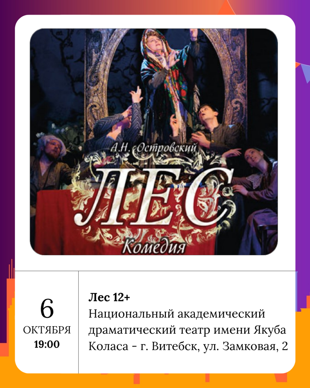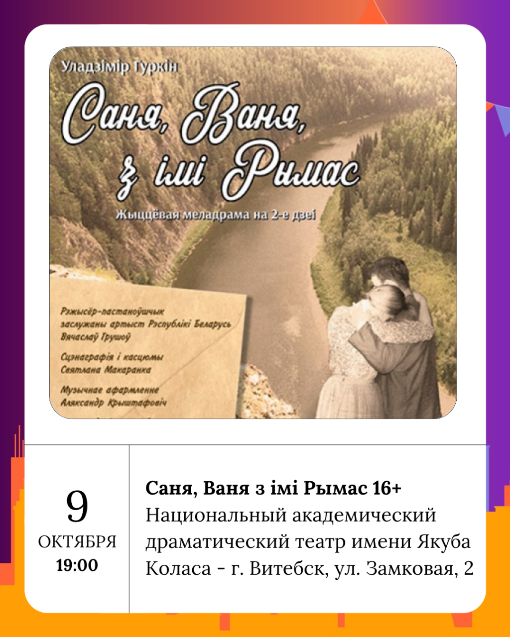 И сегодня на сцене театра им. Я. Коласа - брянский театр драмы им.А.К. Толстого с постановкой Лес 12+. Завтра в том же исполнении - Любовь в стиле барокко 16+. А в четверг витебские артисты пригласят на Саня, Ваня з імі Рымас 16+ — проникновенную историю трёх сестёр из уральской деревни, чьи судьбы переплетаются на фоне войны, любви и потерь. Это не просто постановка, а исповедь о стойкости, выборе и надежде, которая звучит особенно сильно в камерной атмосфере театра.