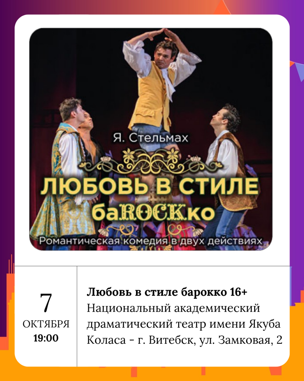 Понедельник в Витебске — это не просто начало недели, а старт культурного марафона! Пока одни только просыпаются, город уже варит кофе вдохновения: театры распахивают кулисы, выставки зовут на прогулку по живописи, а концерты обещают встряхнуть даже самых сонных. Так что забудьте про «тяжёлый день» — в афише 6 октября понедельник выглядит как пятница, только с сюрпризом!