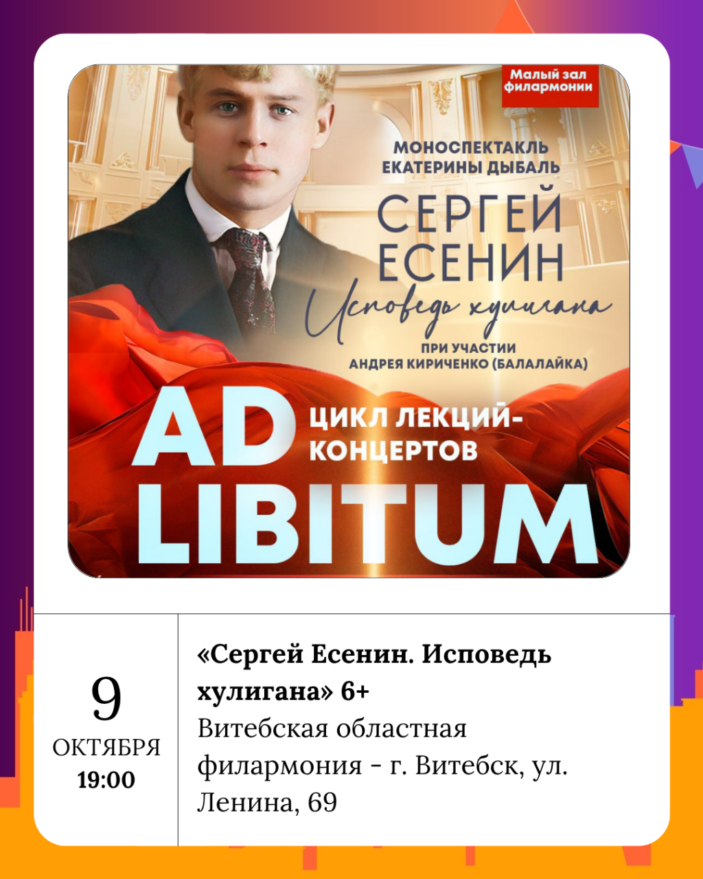 Владимирский Губернаторский симфонический оркестр 6+ выступит с концертом во вторник в филармонии. В рамках цикла лекций-концертов «Ad libitum», посвященного синтезу искусств, 9 октября состоится моноспектакль Екатерины Дыбаль «Сергей Есенин. Исповедь хулигана». Мероприятие приурочено к 130-летию со дня рождения одного из самых любимых русских поэтов – Сергея Есенина.