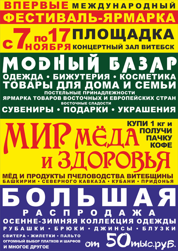 "Модный базар" в Витебске Впервые на площадке у КЗ "Витебск" проходит международный фестиваль-ярмарка: "Модный базар"! С миром меда и здоровья, а также большая распродажа осенне-зимней коллекции одежды от 50 000 руб. Ждем Вас! С 7 по 17 ноября - шатер у концертного зала "Витебск".