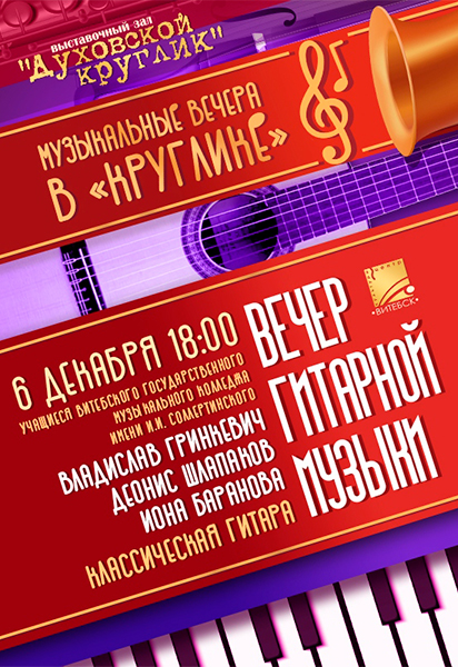 ВЕЧЕР ГИТАРНОЙ МУЗЫКИ пройдет сегодня в 18.00 в Духовском Круглике. Завораживающую музыкальную программу представят учащиеся Витебского государственного музыкального колледжа имени И. И. Соллертинского, лауреаты многочисленных международных и республиканских конкурсов Иона БАРАНОВА, Деонис ШЛАПАКОВ и Владислав ГРИНКЕВИЧ.