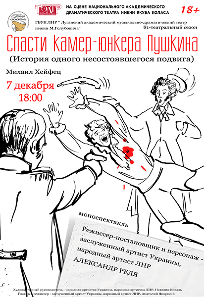 На сцене национального академического драматического театра имени Якуба Коласа - Луганский академический музыкально-драматический театр им. М.Голубовича с моноспектаклем Спасти камер-юнкера Пушкина 18+ в субботу в 18.00, а в воскресенье - с трагикомедией Последняя любовь Деда Мороза 16+.