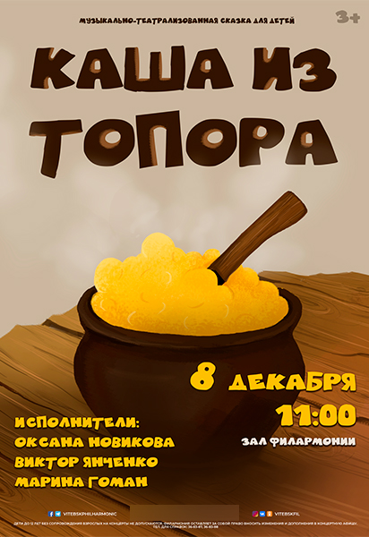 Специально для маленьких гурманов нашего города артисты филармонии подготовили необычное блюдо. В новой музыкальной сказке они приготовят кашу из… топора! Рецепт этого изысканного деликатеса довольно прост: одна жадная хозяйка, один голодный солдат, вода, топор и щепотка смекалки. Дегустация ароматной и полезной похлебки состоится в зале филармонии в воскресенье в 11.00.