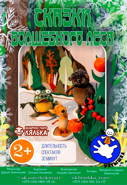 Театр кукол "Ухтышка", г. Витебск покажет интерактивный спектакль Сказки волшебного леса 2+ на сцене Белорусского театра Лялька в субботу в 17.00, а в воскресенье - в 11.00.