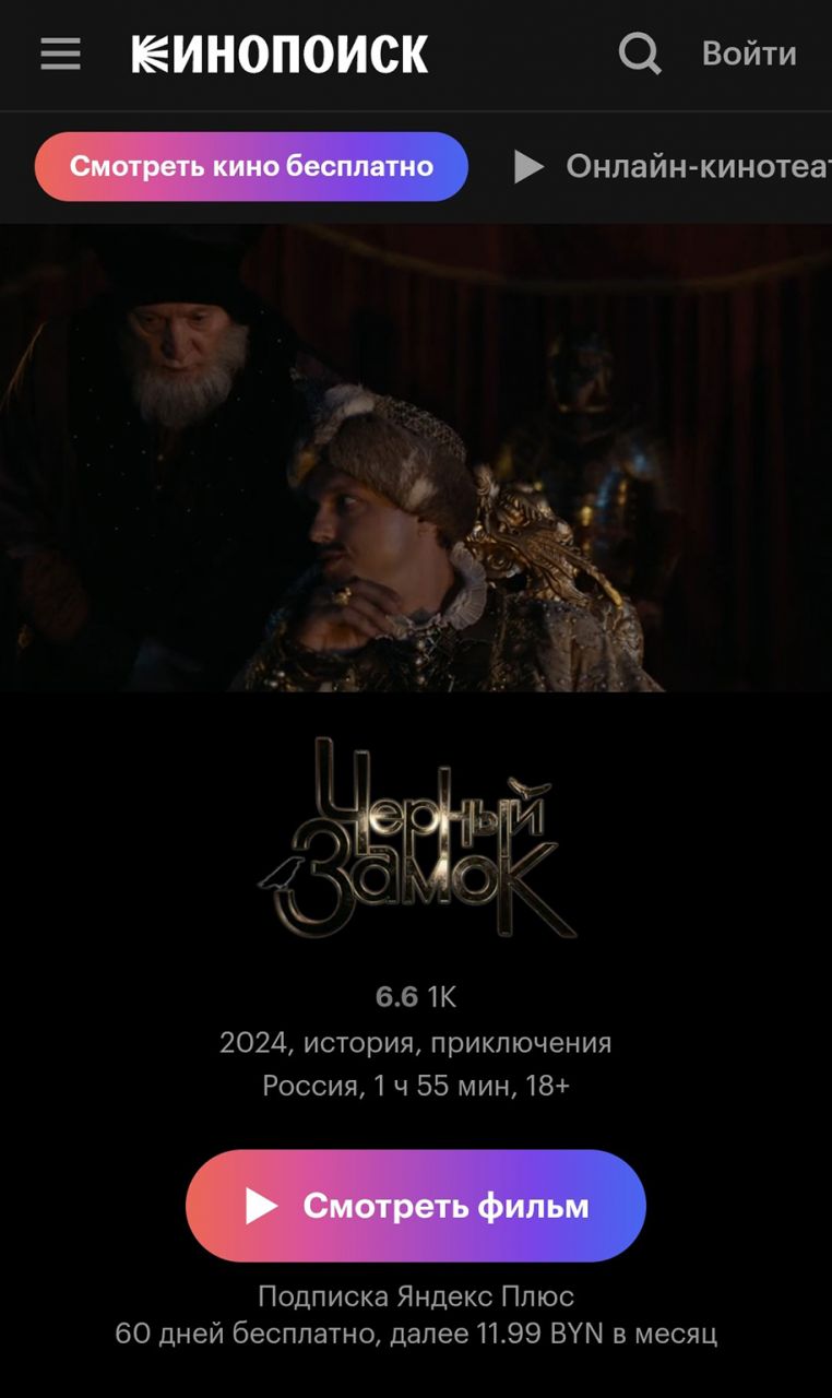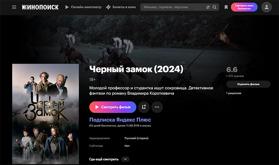 «Чёрный замок» можно посмотреть на Кинопоиске по подписке Яндекс Плюс. Помимо фильмов и сериалов, она дает доступ к трекам, подкастам и плейлистам в Яндекс Музыке, а еще электронным и аудиокнигам в Яндекс Книгах. Предусмотрен кешбэк баллами Плюса на поездки, заказы и покупки в сервисах Яндекса.