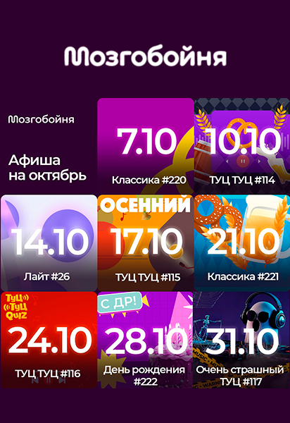 Традиционно размять мозги можно в классической Мозгобойне #220 - игра обо всём и для всех в понедельник в 19.00. Туц Туц Квиз "Октоберфест" #114 - классическая музыкальная игра с песнями всех жанров и эпох с настроением пенного праздника - в четверг.