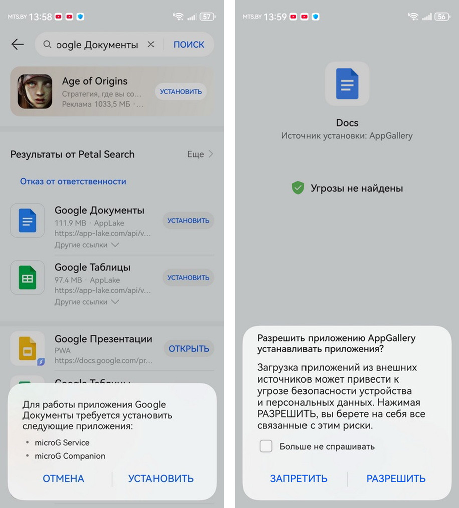Специально искать microG (микроДжи) не обязательно. Можно начать с установки любого совместимого с ним приложения. В нашем случае это были Google Документы. Чтобы сделать это, просто зайдите в Huawei AppGallery, вбейте название приложения и нажмите «Установить». И система тут же предложит установить все компоненты microG (микроДжи).