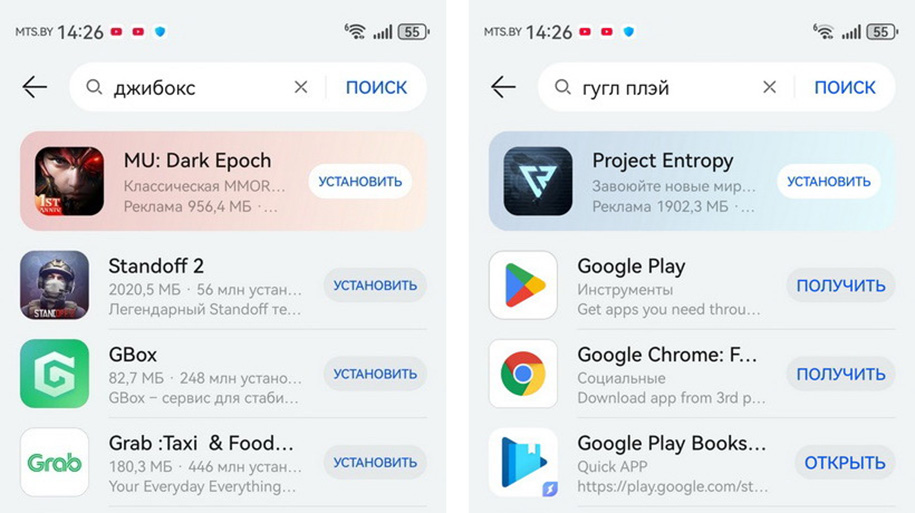 Получить его в свое распоряжение просто. Вновь заходим в Huawei AppGallery, вбиваем «джибокс» и жмем «Установить». Через некоторое время иконка приложения отобразится в смартфоне. Можно поступить иначе, например, набрать «гугл плэй». Далее выбираем «Получить» напротив соответствующей иконки, и GBox (ДжиБокс) подтянется автоматически.