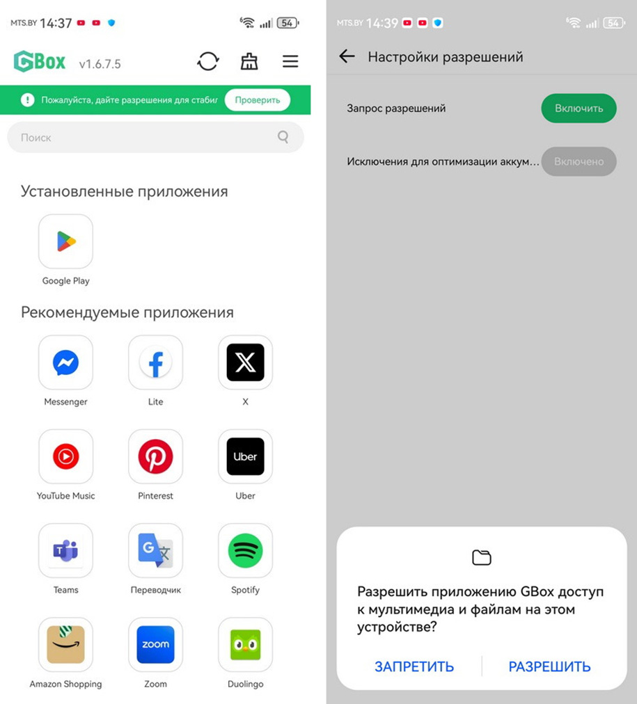 После скачивания запускается установка. Далее заходите в приложение, дайте ему разрешение на доступ к мультимедиа и файлам и добавьте его в исключения для оптимизации батареи, иначе Google-сервисы могут работать нестабильно. Ссылка на эти настройки будет видна сразу же в верхней части экрана и сопровождаться бегущей строкой.