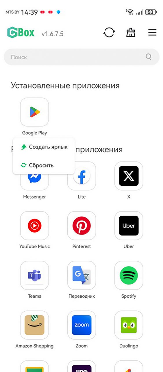 Значок Google Play можно вынести на рабочий стол, чтобы не заходить лишний раз в приложение GBox (ДжиБокс). Для этого нажмите и удерживайте некоторое время иконку, а затем выберите команду «Создать ярлык».