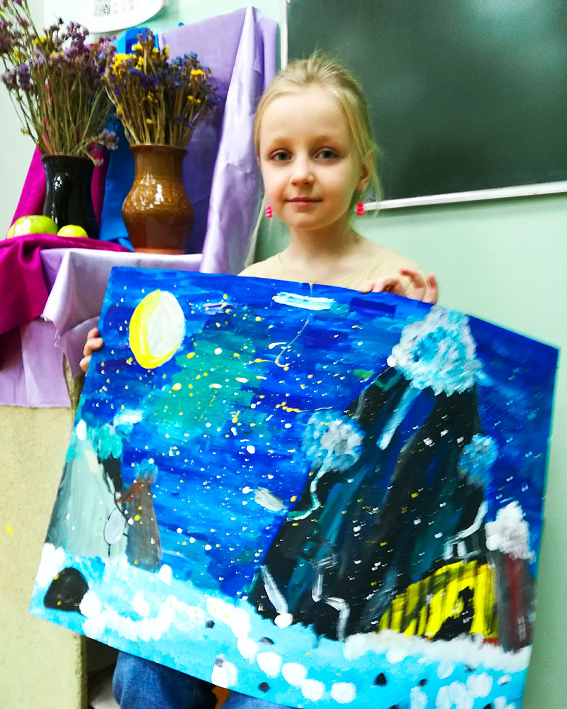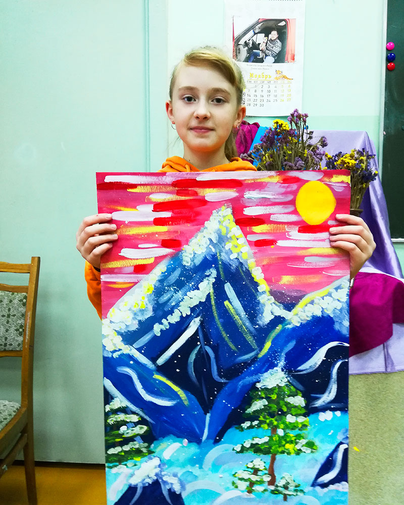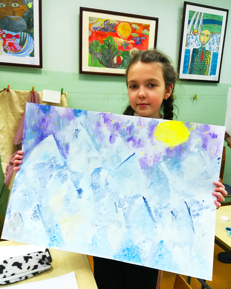 Полные восторга и вдохновленные яркостью цвета картин Николая Рериха, дети написали свои горные пейзажи, не жалея сил и красок.