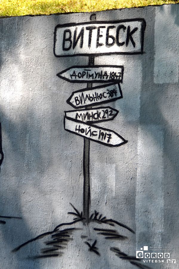 Алессандро Альтхаус из Нойса запечатлел на стене целую историю своего путешествия через Дортмунд, Вильнюс и Минск в Витебск. Парень учится в Дюссельдорфе. Он занял 1 место в номинации «Граффити и стрит-арт» на майской АРТ-сессии. Поэтому его снова пригласили в Витебск. Это я узнала от его переводчика. Хотя даже без помощи и без знания немецкого языка всю историю Алессандро Олдхауса (такой псевдоним он себе выдумал) можно «прочесть» по его граффити.