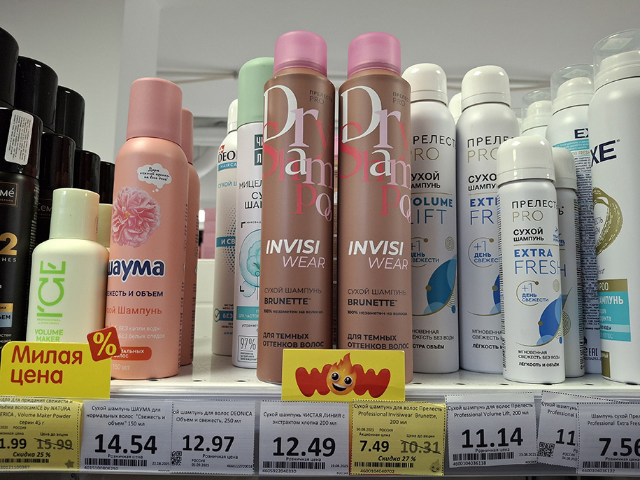 В частности, похорошели цены на товары по уходу за собой. Так, сухой шампунь «Прелесть Professional» теперь стоит 7,49 руб., а большой шампунь Clear 650 мл обойдется в 14,99 руб. Антиперспирант Dove «Ритуал красоты» можно взять за 6,99 руб., а многофункциональный спрей для волос Likato Professional 17-в-1 — за 10,99 руб. Из новинок — бренд Mixit: шампунь Collagen & Seaweed за 20,46 руб., бальзам за 21,59 руб. и крем для рук и тела с пряным ароматом черного перца за 24,29 руб.