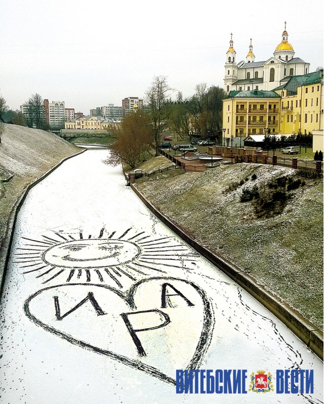 Огромное сердце с надписью «Ира» появилось на замерзшем русле реки Витьба в районе Октябрьского моста и не на шутку взволновало многих обладательниц этого женского имени, которые всерьез задумались, не им ли адресовано анонимное послание. Остальным прохожим пришлось довольствоваться лишь изображением игриво подмигивающего им солнышка.