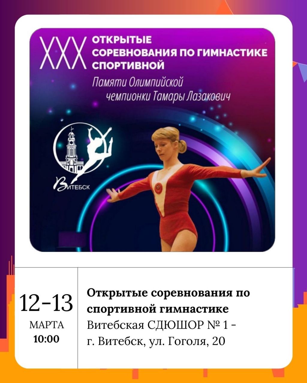 В Витебской СДЮШОР №1 пройдут «XXX Открытые соревнования по спортивной гимнастике», посвященные памяти Олимпийской чемпионки Томары Лазакович. Приходите поддержать юных спортсменов!